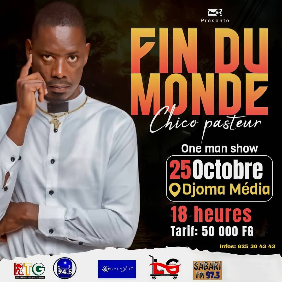 Le rendez-vous est fixé au 25 octobre 2025 à Djoma Média. Ce jour-là, le public guinéen découvrira « Fin du Monde », le tout premier One Man Show de Chico Pasteur, humoriste et comédien au talent reconnu sur la scène nationale. Produit par Baz’Art, structure qu’il a cofondée et dont il est le directeur artistique, ce spectacle marque un tournant décisif dans sa carrière.