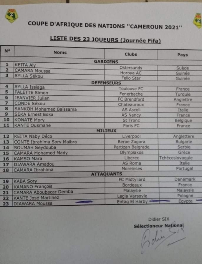 Le technicien français Didier Six a rendu officiel sa liste ce jeudi matin au siège de la fédération guinéenne de football, une liste qui intervient dans le cadre de la double confrontation entre la Guinée et le Tchad (le 27 -29 Mars). Le français Didier n'a retenu que 23 joueurs on retrouve Naby Keita de Liverpool, Ousmane Kante, Amadou Diawara...