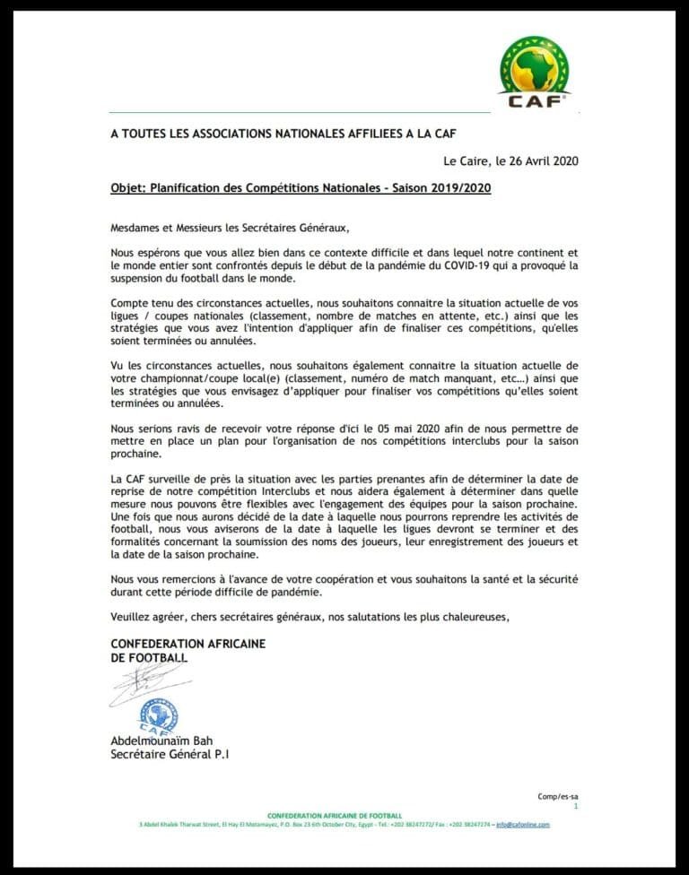 A travers un courrier adressé aux différentes Fédérations africaines, la confédération africaine de football demande à toutes ses associations de se prononcer d'ici le 5 Mai.
