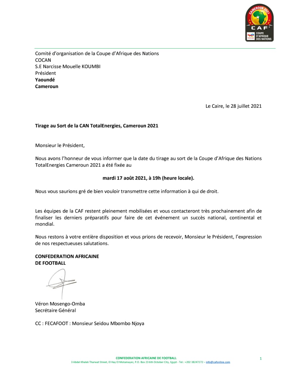 Dans la journée d'hier mercredi, la Fédération camerounaise (Fecafoot), pays-hôte de la compétition, a dévoilé un courrier de la CAF qui officialise et met enfin un terme au suspens sur la date du tirage au sort de la plus prestigieuse compétition inter-africaine.