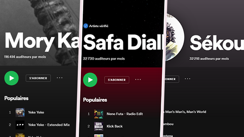 Sur un échantillon tiré, les artistes guinéens les plus écoutés sont classés par ordre de mérite. Après un an de sa disparition, l'auteur du célèbre titre Yèkè Yèkè, feu Mory Kanté, demeure encore dans le cœur de mélomanes de cet art, c'est pour cette raison qu'il caracole au top avec 116 414 auditeurs par mois qui le kiff sur Spotify, suivi en seconde place par le jeune Safa Diallo avec 32 730 auditeurs, et en 3e place vient Sékouba Bambino avec 32 218 auditeurs par mois.